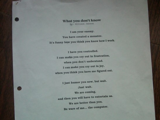 If you’re curious, Allie got an A on her project. Her teacher’s comment read “May I have perspective? You have caught the feeling many have of computers.”