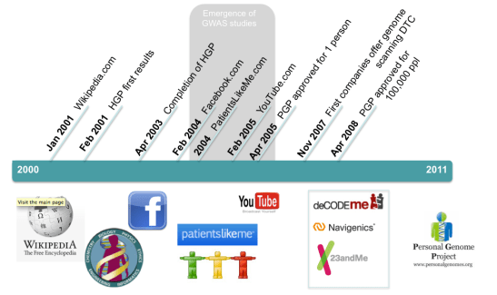 I thought I’d share this timeline that I put together recently for a presentation on the social asepcts of genomics. Although clearly not an exhaustive list of events, I still find it interesting to see the major milestones in genomics side-by-side the evolution of the social web. Not only does this provide a potential explanation for why the genomics industry has developed the way that it has, but it helps to illustrate the relationship between genomics and social media: openness, connectivity, patient autonomy and citizen science.